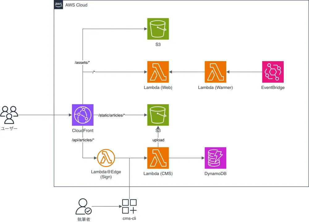 CMS バックエンドは、S3 + DynamoDB + Lambda で構築しました。DynamoDB に記事のメタデータを保存し、S3 に記事のコンテンツを保存しています。 これらの管理は Lambda 関数で行っています。